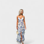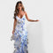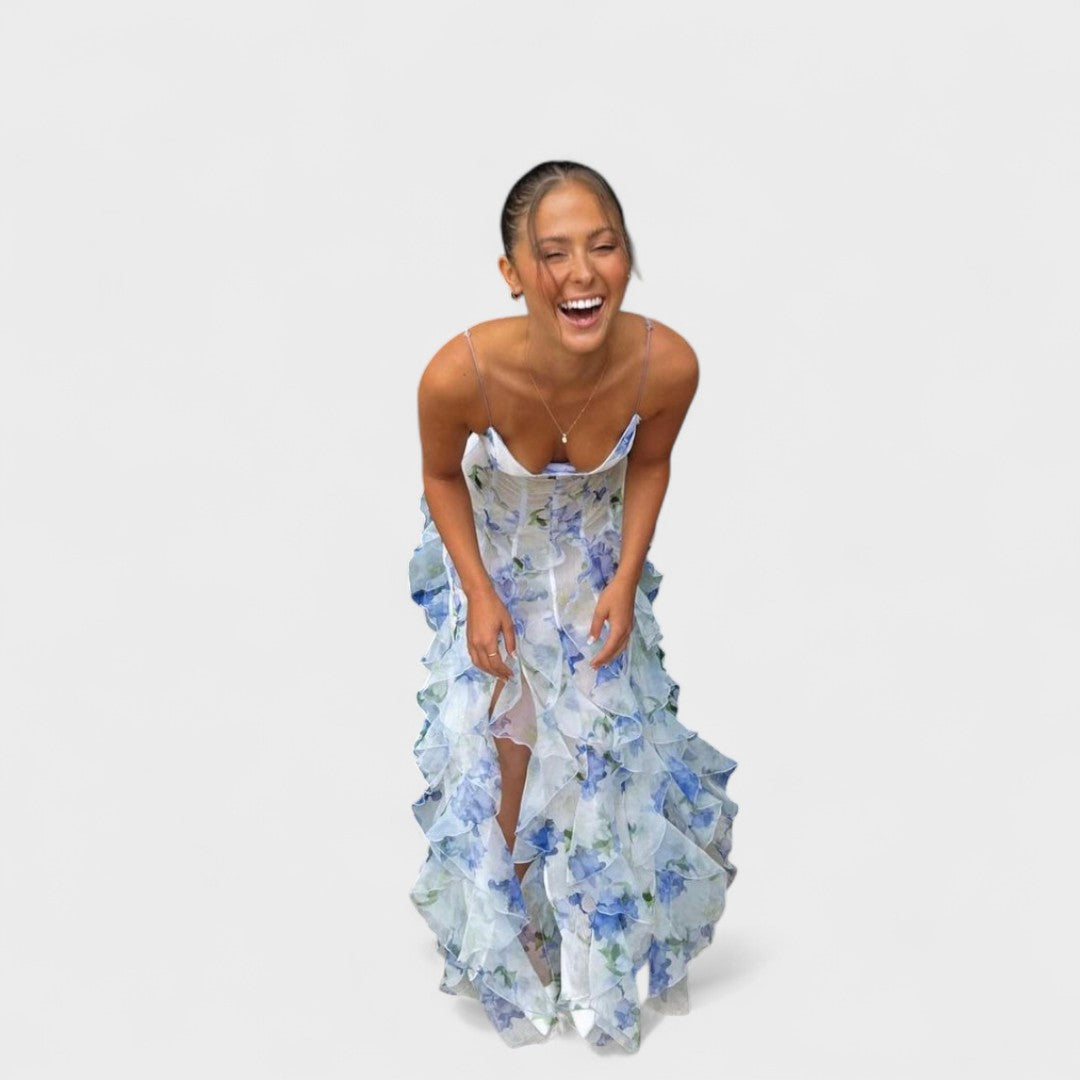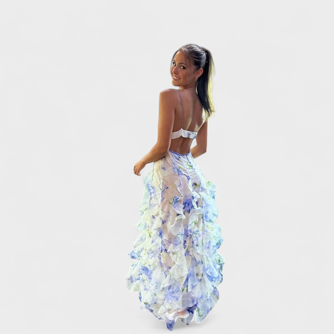 Тази дълга цветна рокля с волани внася нотка на изисканост и елегантност във всяка ситуация. Благодарение на женствения си силует и разкошните детайли, предлага безупречен баланс между комфорт и блясък. Идеална е за тържествени поводи, празненства или специални моменти, когато искате да блеснете.