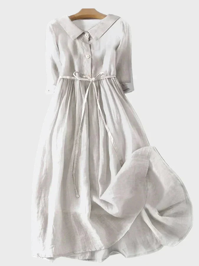 Тази нежна синя рокля излъчва спокойствие и елегантност, идеална за всякакви поводи. Нейният прост силует осигурява комфорт и вечен стил, докато коланът в талията придава женствена фигура с естествено падане на тъканта.