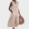 Тази елегантна рокля без ръкави е перфектната комбинация от комфорт и стил. Проектирана с V-изряз и копчета отпред, роклята предлага небрежен, но изискан вид. Проветливият крой позволява свобода на движението, докато практичните джобове добавят функционалност. Идеална е за дневни разходки, почивки или неформални срещи.