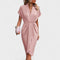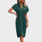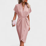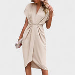Елегантна миди рокля с изискан V-образен деколте, нежни набръчквания в талията и дискретен разрез, който удължава силуета. Меката, гъвкава материя красиво пада и осигурява комфорт през целия ден, докато чистите линии позволяват лесно стилизиране – от бизнес поводи до тържествени вечери.